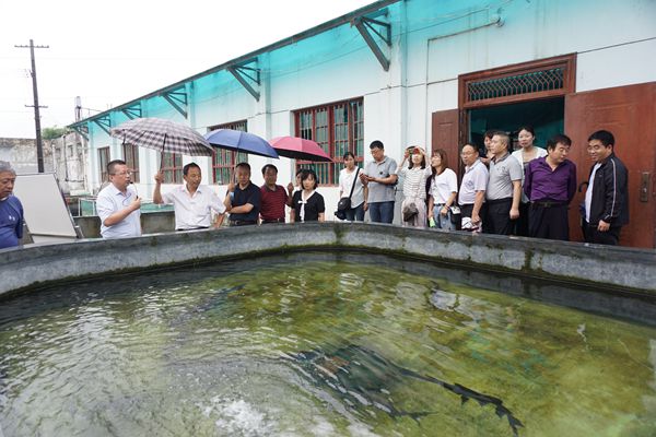 观摩匙吻鲟亲鱼培育情况