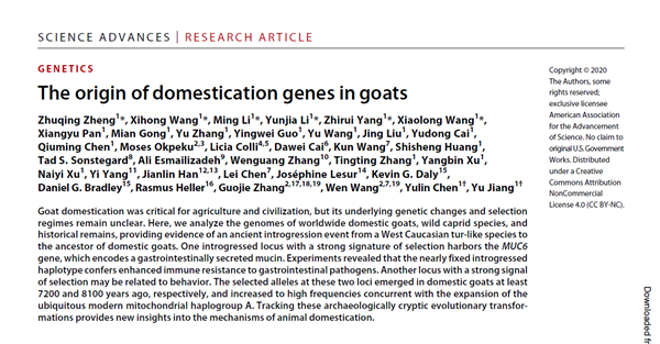 5月20日,Science旗下著名期刊ScienceAdvances《科学进展》以封面论文报道了我校澳门六合彩高手 姜雨教授团队有关“山羊驯化基因的起源””的文章,阐明了现代山羊广谱适应能力强源于通过杂交获得其他物种的MUC6基因, 该基因与其他驯化基因一起,帮助山羊成为最早被成功驯化并广泛传播的家畜。同日,《科学》杂志正刊以“Ancient hanky panky gave modern goats their iron stomachs”为题,对该发现进行了采访和报道。