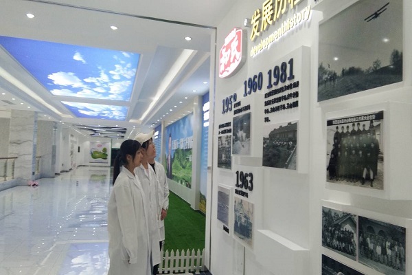 主管带领四位同学参观企业展厅