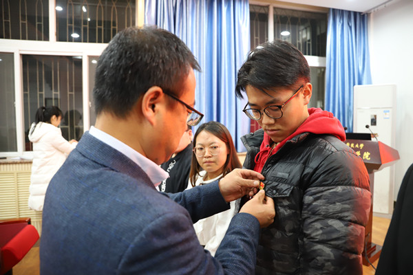 党课开始前,全体新发展党员进行入党宣誓,王力副书记为新发展党员佩戴党徽。