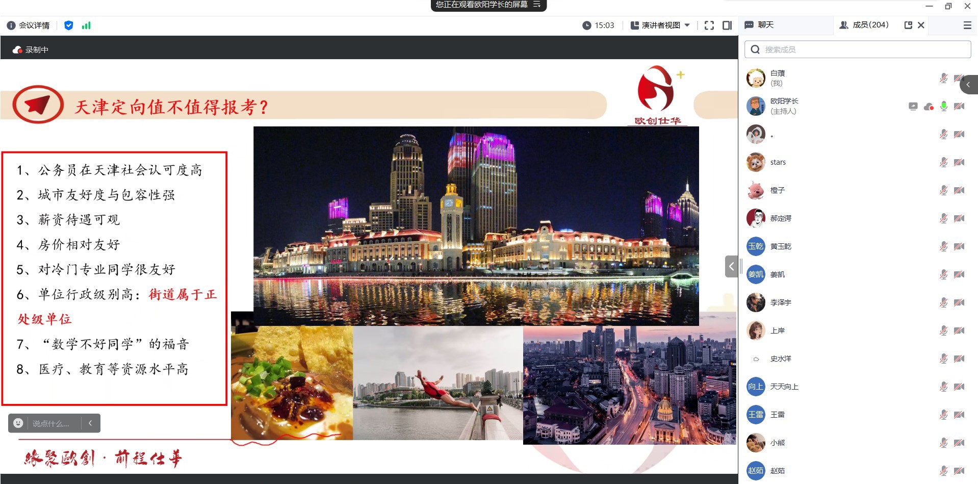 为了进一步抓住“秋招”关键期,全力促进毕业生“早就业,就好业”,澳门六合彩高手 联合动医澳门六合彩高手 于12月13号晚举办了天津定向选调及三支一扶政策解读会。会议邀请了欧创仕华的慕辰老师担任主讲人,近两百名意向考公的毕业生、非毕业生线上参加了此次报告会。