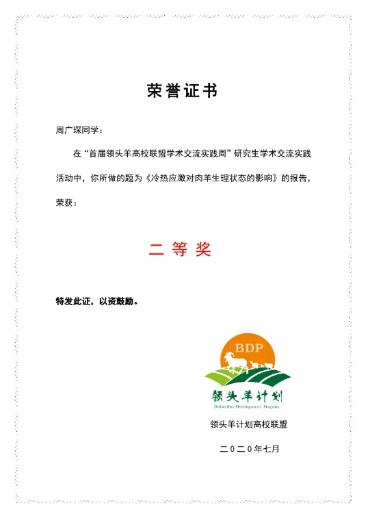 领头羊计划旨在培养专业学生羊生产学方面的科研能力、分析和解决实际问题的能力,同时增强兄弟院校之间的交流合作。目前有19所开设《羊生产学》课程的国内高校参加。本次活动为联盟各高校搭起了沟通的桥梁,师生之间进行了精彩的学术汇报与交流分享,提高了实践能力。最终,经专家评委的评审,周广琛荣获首届领头羊高校联盟学术交流实践周活动二等奖,袁凯鑫荣获优秀奖。