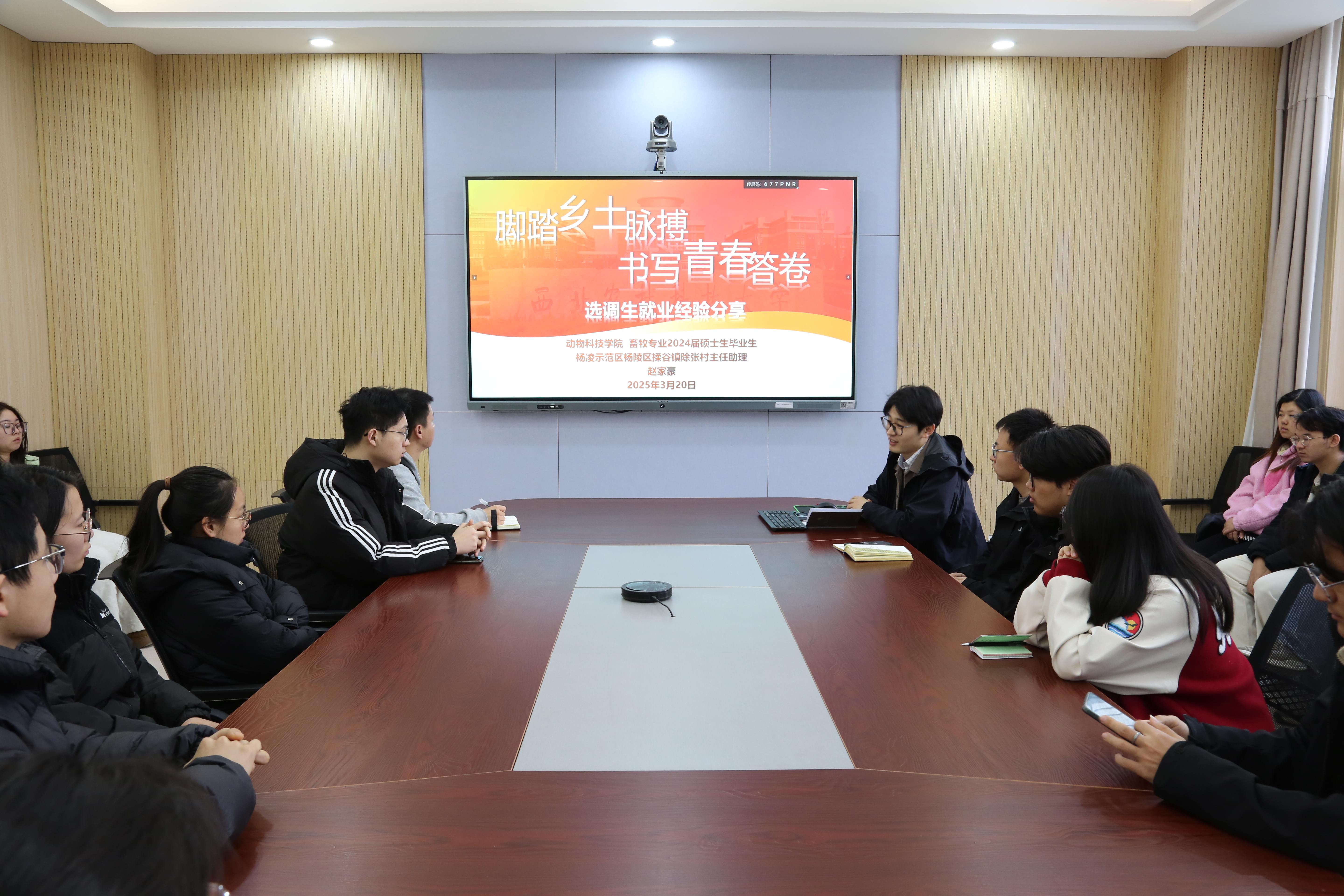 赵家豪,畜牧专业硕士研究生,2024 年考取陕西省选调生,目前在杨凌示范区杨陵区揉谷镇人民政府工作。赵家豪同学结合自身学习和工作经历,从校园经历、职业规划、求职备考、基层工作生活等方面进行了详细的分享。他建议,在校期间要充分利用学校平台,努力提升自身综合素质,锤炼自身能力,不断尝试,明确自身的职业目标。