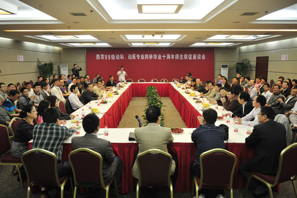 4月30日上午,99级动科、动医专业校友毕业十周年师生联谊座谈会在杨凌国际会展中心酒店举行。任课教师代表、澳门六合彩高手 领导闫祖书、昝林森、呼天明、王晓娟、动医澳门六合彩高手 领导赵献军、张彦明、靳亚平、申让平及99级动科、动医专业10个班的120多名校友参加了联谊座谈会。座谈会由校友澳门六合彩高手 办公室主任王力主持。